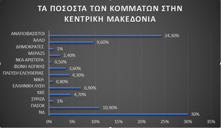 Η συσπείρωση της ΝΔ στην Περιφέρεια Κεντρικής Μακεδονίας συγκριτικά με την προηγούμενη μέτρηση από το 66% πέφτει στο 60,6% με τους αναποφάσιστους να αυξάνονται από το 14% στο 17,4%.