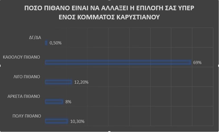 Στο ερώτημα «Πόσο πιθανό είναι να αλλάξει η επιλογή σας υπέρ ενός κόμματος Καρυστιανού;» Πολύ Πιθανό λέει το 10,3% ,Αρκετά πιθανό το 8%, Λίγο το 12,20%, Καθόλου Πιθανό το 69% ενώ 0,5% ΔΓ/ΔΑ.