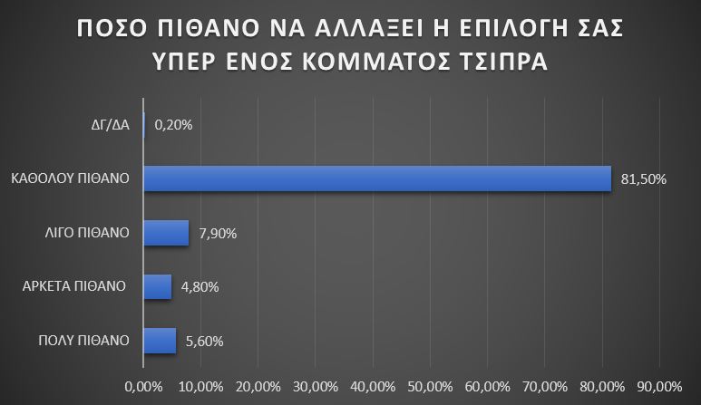 Σε αντίστοιχο ερώτημα για τον Αλέξη Τσίπρα το Πολύ Πιθανό αγγίζει μόλις το 5,6% , Αρκετά πιθανό το 4,8%, Λίγο το 7,9%, Καθόλου Πιθανό το 81,5% ενώ 0,2% ΔΓ/ΔΑ .