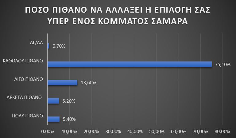 Στο ερώτημα «Πόσο πιθανό είναι να αλλάξει η επιλογή σας υπέρ ενός κόμματος Σαμαρά;» Πολύ Πιθανό λέει μόλις το 5,4% ,Αρκετά πιθανό το 5,2%, Λίγο το 13,%, Καθόλου Πιθανό το 75,1% ενώ 0,7% ΔΓ/ΔΑ .