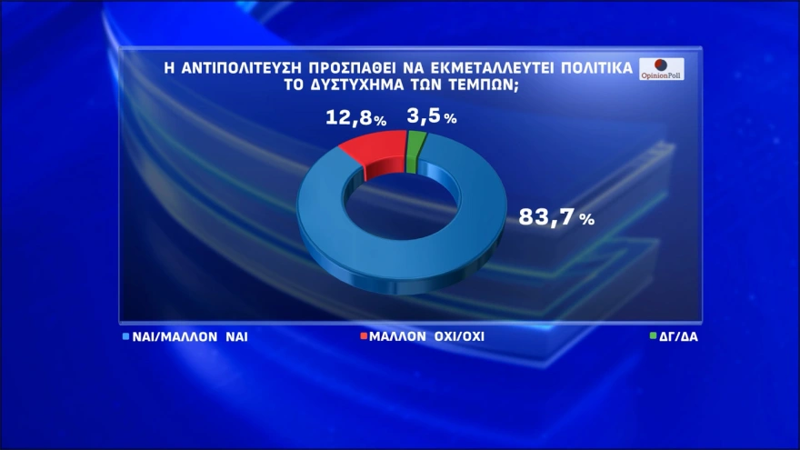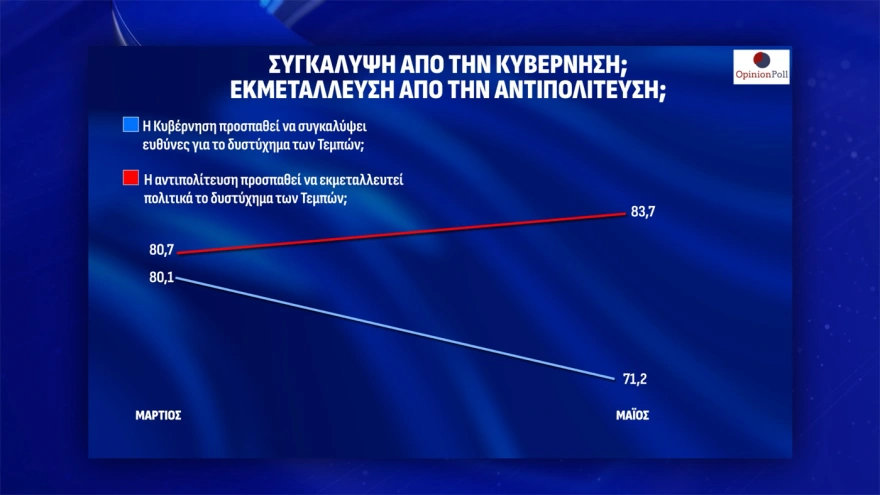 Στον αντίποδα, το 83,7% θεωρεί ότι η Αντιπολίτευση εκμεταλλεύεται πολιτικά το δυστύχημα, έναντι 80,7% τον Μάρτιο. Η αύξηση αυτή κατά 3% αποτυπώνει το κόστος της στείρας αντιπολίτευσης και της εργαλειοποίησης της ανθρώπινης οδύνης.