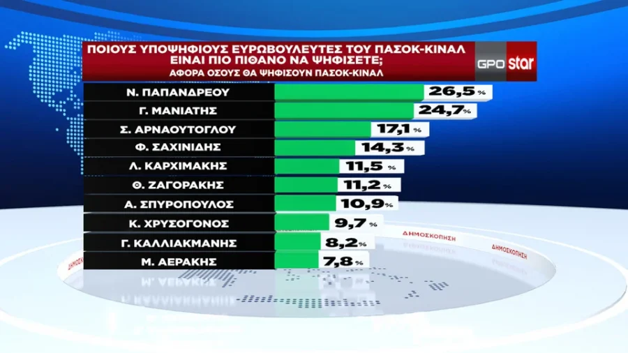 Αντίστοιχα στην πρώτη πεντάδα των υποψηφίων του ΠΑΣΟΚ πρώτος είναι ο Νίκος Παπανδρέου με 26,5%, δεύτερος ο Γιάννης Μανιάτης με 24,7% και ακολουθούν Σάκης Αρναούτογλου, Φίλιππος Σαχινίδης και Λευτέρης Καρχιμάκης.
