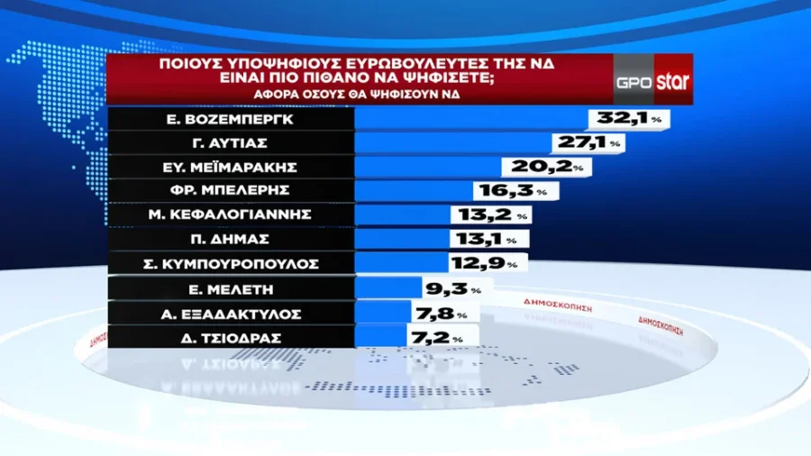 Μεταξύ των υποψήφιων ευρωβουλευτών της ΝΔ, πρώτη στις προτιμήσεις των ερωτηθέντων έρχεται η Ελίζα Βόζεμπεργκ με 32,1%. Και ακολουθούν: Γιώργος Αυτιάς 27,1%, Βαγγέλης Μεϊμαράκης 20,2%, Φρέντης Μπελέρης 16,3%, Μανώλης Κεφαλογιάννης 13,2%, Πύρρος Δήμας 13,1%, Στέλιος Κυμπουρόπουλος 12,9% Ελεονώρα Μελέτη 9,3% ενώ την πρώτη δεκάδα συμπληρώνουν ο Αθανάσιος Εξαδάκτυλος και ο Δημήτρης Τσιόδρας.