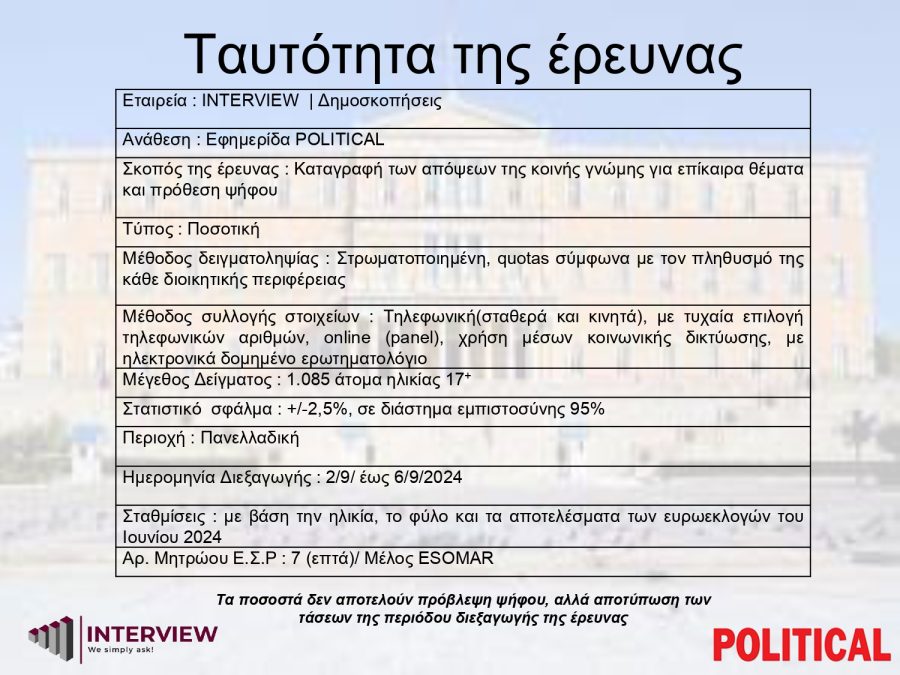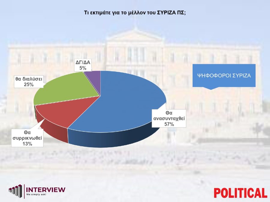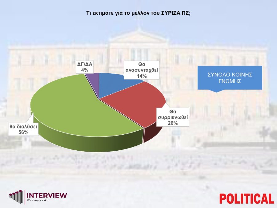 Διάλυση του ΣΥΡΙΖΑ βλέπει ένας στους δυο ψηφοφόρους σύμφωνα με την δημοσκόπηση που διενήργησε η εταιρεία Interview για λογαριασμό της διαδικτυακής εφημερίδας «Political» από το διάστημα 2 έως 6 Σεπτεμβρίου.