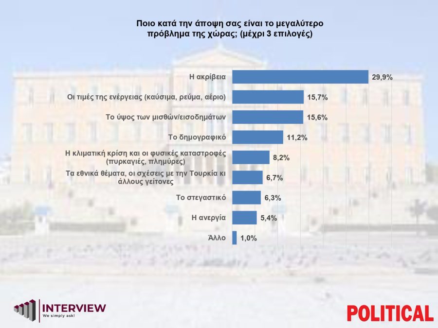 Η κυβέρνηση εξακολουθεί πάντως, να κινείται δημοσκοπικά σε χαμηλές «πτήσεις» οι οποίες τείνουν να σταθεροποιηθούν μετά τις ευρωεκλογές. Τα μεγαλύτερα προβλήματα παραμένουν η ακρίβεια, οι τιμές στην ενέργεια και το ύψος των μισθών και εισοδημάτων.