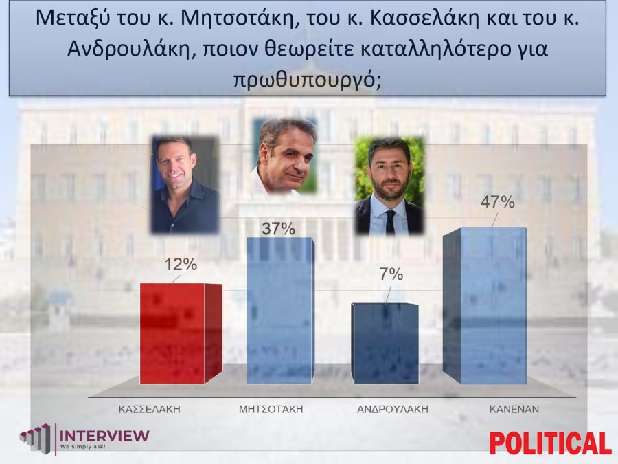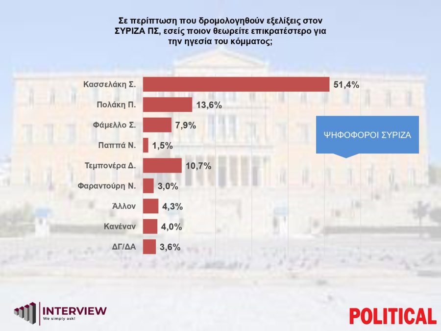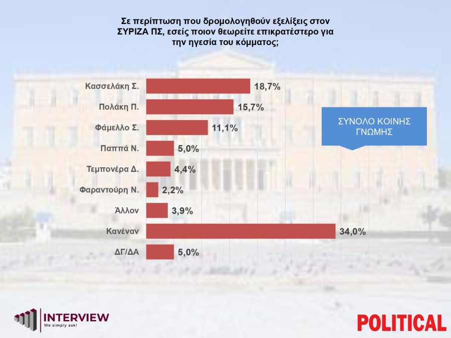Εντυπωσιακότερο όμως είναι το στοιχείο πως ανάμεσα στο σύνολο των ψηφοφόρων κατά ποσοστό 34% εκτιμάται ότι επόμενος αρχηγός του ΣΥΡΙΖΑ θα είναι ο … κανένας καθώς, αρκετά πίσω σε ποσοστό λίγο άνω του 18% υπάρχει η αίσθηση της υπεροχής του Στέφανου Κασσελάκη.