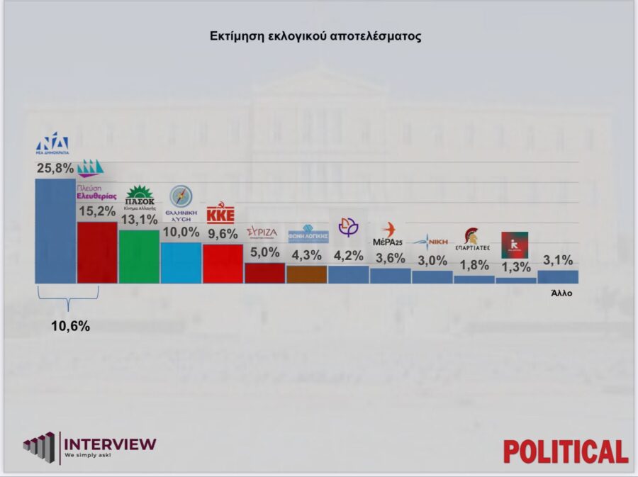Μπροστά με ποσοστό 25,8% στην εκτίμηση εκλογικού αποτελέσματος βρίσκεται η Νέα Δημοκρατία ενώ με βάση τα ευρήματα της ίδιας δημοσκόπησης, στη δεύτερη θέση ανεβαίνει η Πλεύση Ελευθερίας της Ζωής Κωνσταντοπούλου με ποσοστό 15,2%, σχεδόν 10 μονάδες κάτω δηλαδή από τη Νέα Δημοκρατία. Το ΠΑΣΟΚ έρχεται στην 3η θέση, ενώ ακολουθεί η Ελληνική Λύση του Κυριάκου Βελόπουλου, τη στιγμή που ο ΣΥΡΙΖΑ «κατρακυλά» στην έκτη θέση και με ποσοστό 5%.