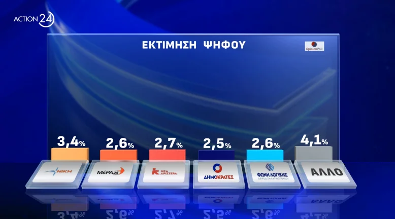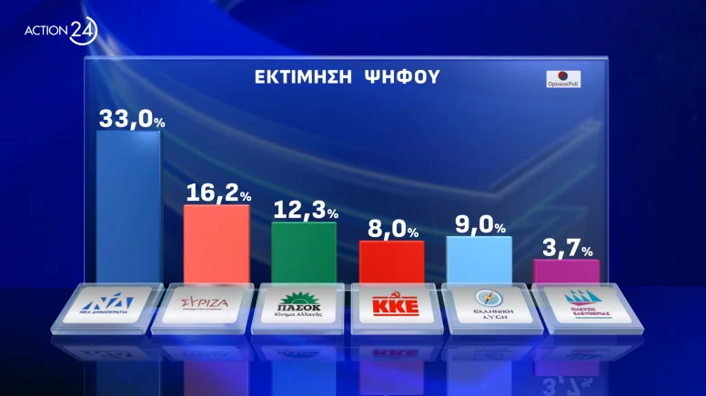 Διαφορά 16,8 μονάδων ως προς την εκτίμηση ψήφου έχει η Νέα Δημοκρατία εν όψει ευρωεκλογών, σύμφωνα με την δημοσκόπηση της Opinion Poll την οποία πραγματοποίησε για το Action 24.