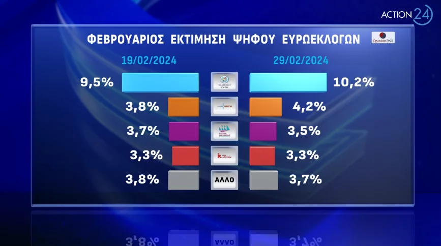 Η δημοσκόπηση της Οpinion Poll για το ACTION 24 καταγράφει την εκτίμηση ψήφου των πολιτών αλλά και την εικόνα των κομμάτων της αντιπολίτευσης. ιδίως την στάση του Στέφανου Κασσελάκη στο συνέδριο,την παρέμβαση Τσίπρα καθώς επίσης και την πορεία του κόμματος προς τις Ευρωεκλογές.