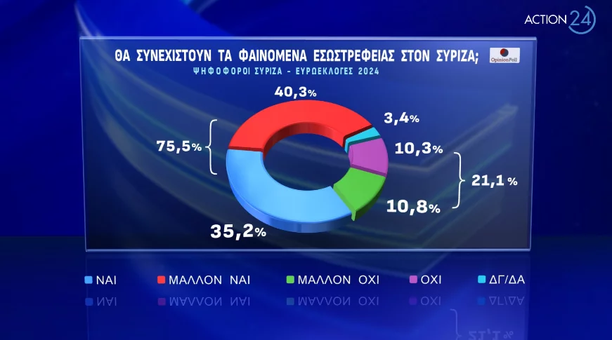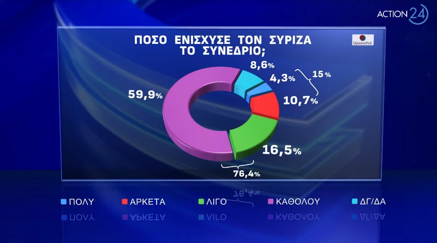 Λίγα 24ωρα μετά το συνέδριο του ΣΥΡΙΖΑ, μια ακόμη δημοσκόπηση, της Opinion Poll για το ACTION24, αποτυπώνει το βαθύ τραύμα που άφησε το Συνέδριο στο κόμμα, την σταθερή κυριαρχία ΝΔ με 20 μονάδες διαφορά από το δεύτερο ΠΑΣΟΚ που, όμως, πέφτει.