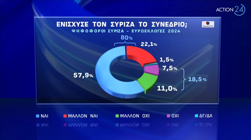 Αντίθετα, οι ψηφοφόροι ΣΥΡΙΖΑ έχουν εντελώς αντίστροφη ανάγνωση, καθώς το 80% απαντά ότι ενισχύθηκε το κόμμα από το Συνέδριο, έναντι 18,5% που πιστεύει πως αποδυναμώθηκε.