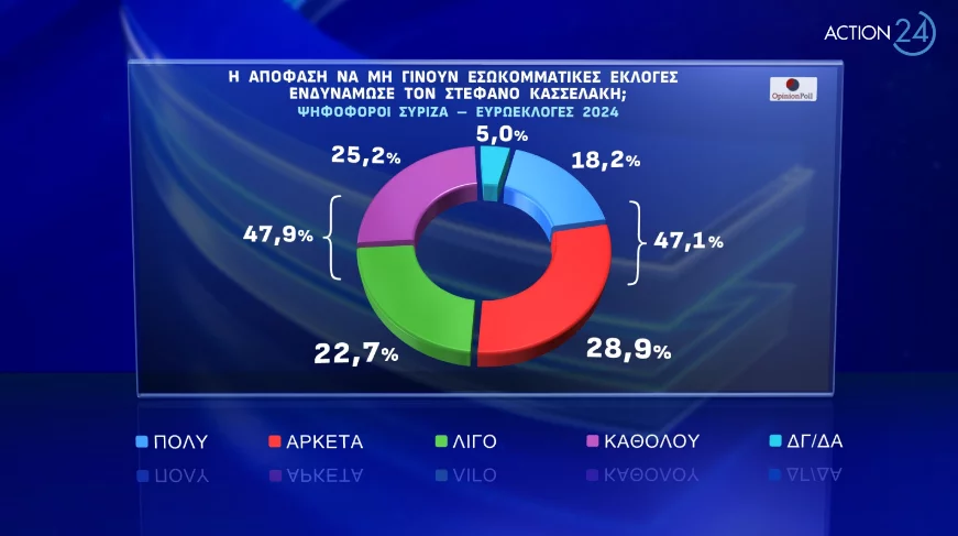 Επίσης η δεξαμενή ψηφοφόρων του ΣΥΡΙΖΑ είναι διχασμένη ως προς το εάν η απόφαση να μην γίνουν εσωκομματικές εκλογές ενδυνάμωσε ή όχι τον Στέφανο Κασσελάκη. Ένα ποσοστό της τάξης του 47,9% απαντά πως δεν τον ενδυνάμωσε, ενώ ένα 47,1% απαντά θετικά ως προς το ερώτημα.