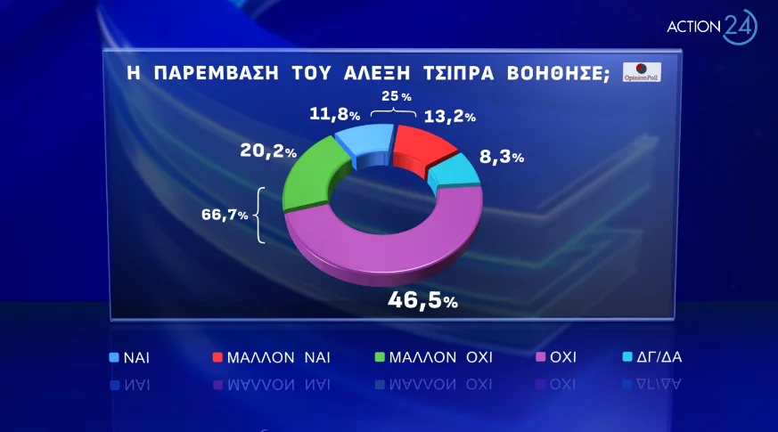 Τέλος για την παρέμβαση του Αλέξη Τσίπρα στο συνέδριο το συντριπτικό ποσοστό της τάξης του 66,7% του συνόλου των ερωτηθέντων εκτιμά πως δεν βοήθησε έναν 25% που θεωρεί το αντίθετο.