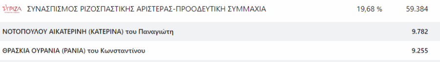 Συγκεκριμένα, πρώτη θέση με τον ΣΥΡΙΖΑ καταλαμβάνει η Κατερίνα Νοτοπούλου με 9.782 ψήφους και από πίσω ακολουθεί η Ουρανία Θρασκιά με 9.255.