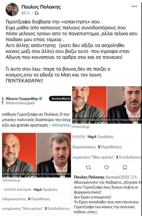 «Γεροτζιάφα, διάβασα την απάντησή σου. Είχα μάθει από κάποιους συνοδοιπόρους σου πόσο γελοίος ήσουν από το πανεπιστήμιο, αλλά τελικά εσύ παιδάκι μου σπας ταμεία. Αντί άλλης απάντησης (γιατί δεν αξίζει να ασχοληθεί κανείς μαζί σου άλλο) σου βάζω αυτό που έγραψα στον Άδωνι που κοινοποιείτο άρθρο σου και σε παινεύει! Γι’ αυτό σου λέω: πάρε τα βουνά, δεν σε παίζει ο κόσμος, σου το έδειξε τον Μάη και τον Ιούνη ΠΕΝΤΑΚΑΘΑΡΑ!!».