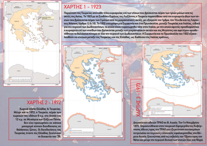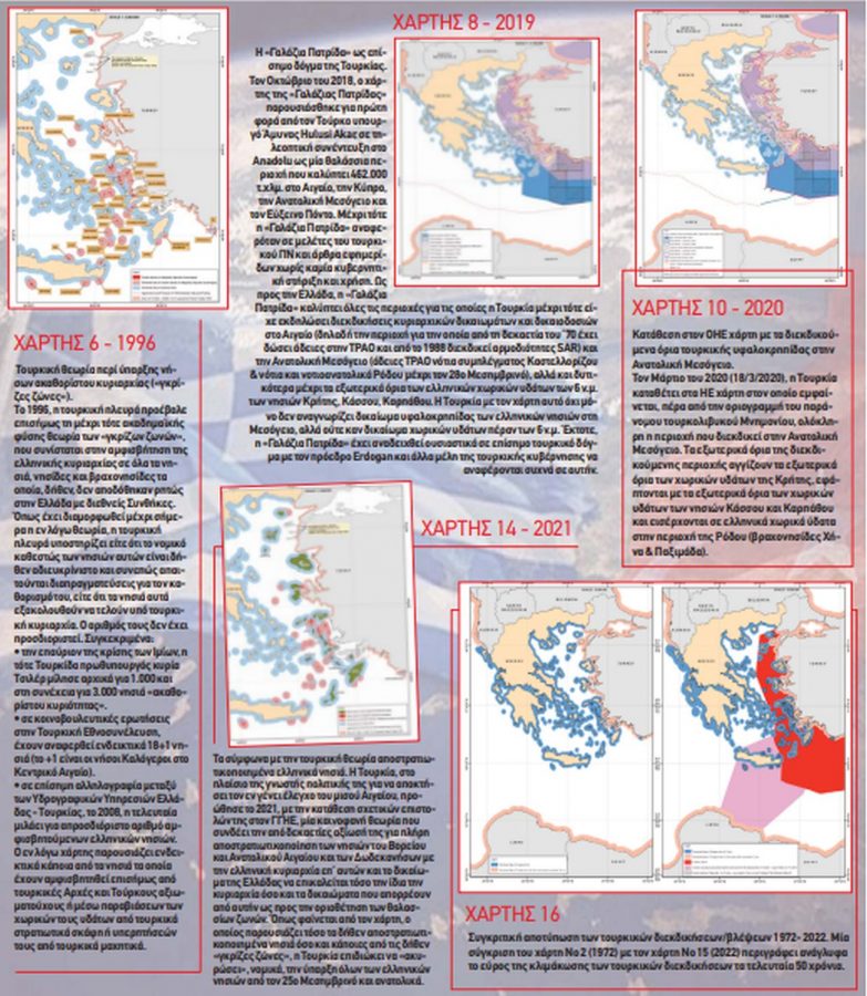 Τα καινοφανή επιχειρήματα πάνω στα οποία στηρίζει την αναθεωρητική πολιτική της η Άγκυρα καταρρίπτουν οι χάρτες που έδωσε στη δημοσιότητα το υπουργείο Εξωτερικών. Σε αυτούς παρουσιάζονται με παραστατικό τρόπο, και στο πέρασμα των ετών, οι παράνομες τουρκικές διεκδικήσεις στο Αιγαίο και την Ανατολική Μεσόγειο και οι μονομερείς ενέργειες της Άγκυρας που παραβιάζουν κατάφωρα το Διεθνές Δίκαιο και το Δίκαιο της Θάλασσας.