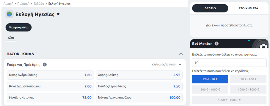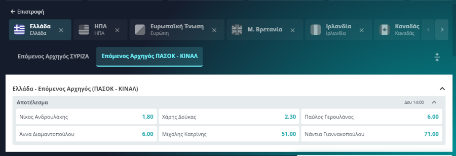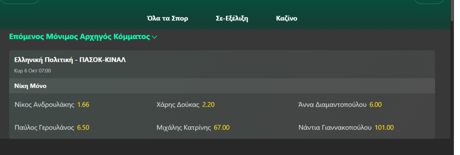 Πιο συγκεκριμένα, η «Stoiximan» και η «bet365» δίνει απόδοση 1.60 και 1.66 για τον Νίκο Ανδρουλάκη, τον νυν πρόεδρο του κόμματος ενώ η «Novibet» ανεβάζει ελάχιστα την απόδοση στο 1.80. Φαίνεται ότι σε «στοιχηματικό» τουλάχιστον επίπεδο ο Ν. Ανδρουλάκης πείθει ότι θα είναι ο «νικητής». Ο Χάρης Δούκας, ο νυν δήμαρχος της Αθήνας, ακολουθεί με απόδοση 2.90 στην «Stoiximan», αλλά στη «Novibet» και στην «bet365» φαίνεται πως η διαφορά στις αποδόσεις με τον Νίκο Ανδρουλάκη είναι πολύ μικρότερη, 2.30 και 2.20 αντίστοιχα.