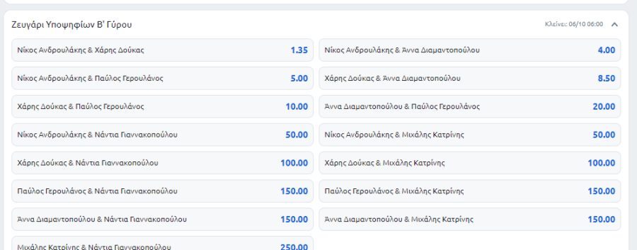 Αποδόσεις για τα πιθανά ζευγάρια στον β’ γύρο
