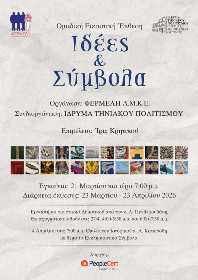 Η Πολιτιστική Εταιρεία ΦΕΡΜΕΛΗ, (phermeli.gr) έχει την ιδιαίτερη χαρά να παρουσιάσει στο Ίδρυμα Τηνιακού Πολιτισμού, από τις 21 Μαρτίου έως τις 23 Απριλίου 2026, την ομαδική εικαστική έκθεση «Ιδέες & Σύμβολα».