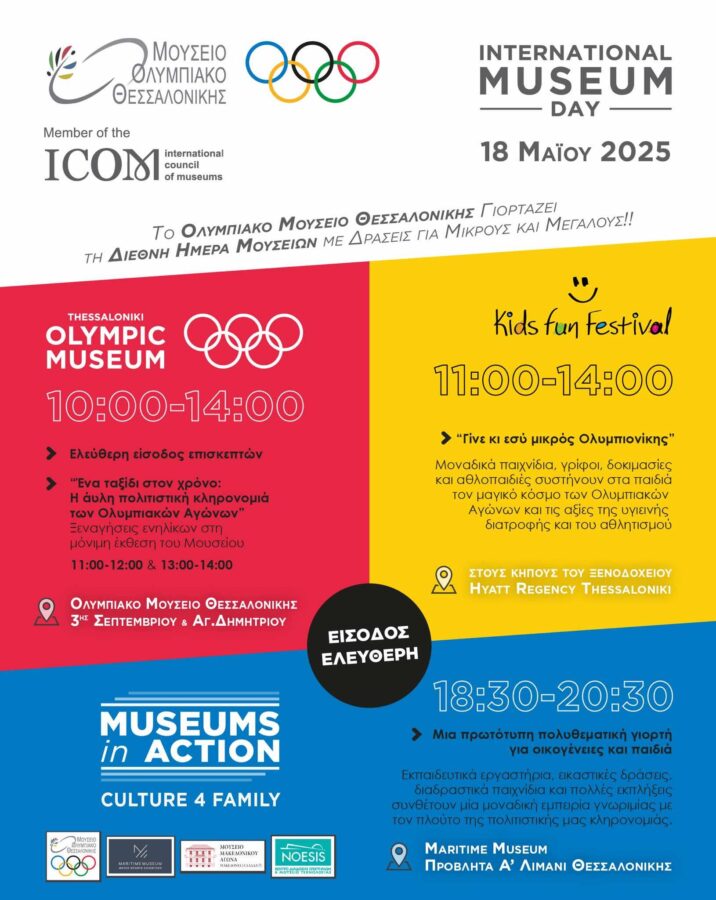 Το Ολυμπιακό Μουσείο Θεσσαλονίκης, μέλος του Διεθνούς Συμβουλίου Μουσείων (ICOM), συμμετέχει ενεργά στον εορτασμό της Διεθνούς Ημέρας Μουσείων και προσκαλεί μικρούς και μεγάλους την Κυριακή 18 Μαΐου 2025 σε ένα πλούσιο πρόγραμμα δραστηριοτήτων «εντός και εκτός» των τειχών του!!