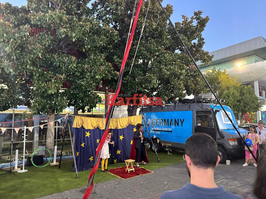 Λίγο μετά τις 19:30 μ.μ., δεκάδες επισκέπτες είχαν συγκεντρωθεί έξω από το περίπτερο 13 της Γερμανίας προκειμένου να απολαύσουν το μοναδικό show ακροβατικών και μαγείας.