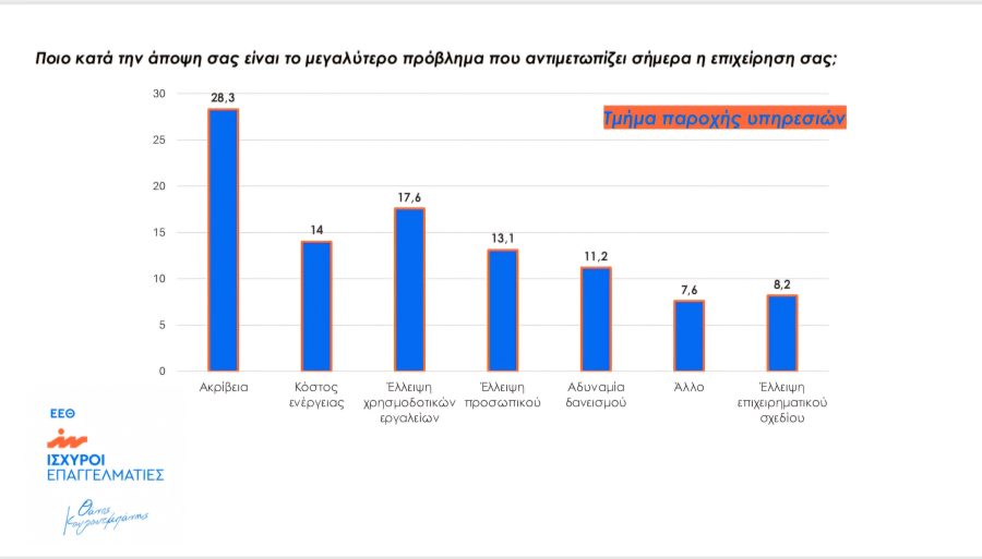 Είναι χαρακτηριστικό πως στην ερώτηση «ποιο είναι το μεγαλύτερο πρόβλημα που αντιμετωπίζει σήμερα η επιχείρησή σας», οι περισσότεροι επαγγελματίες απάντησαν πρώτη την ακρίβεια, δεύτερο το κόστος ενέργειας, έπειτα την έλλειψη χρηματοδοτικών εργαλείων και μετά την έλλειψη προσωπικού.