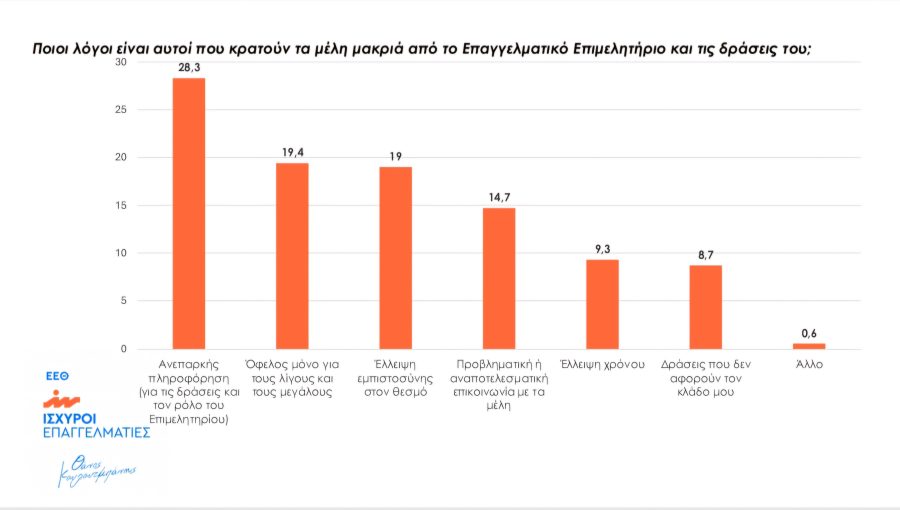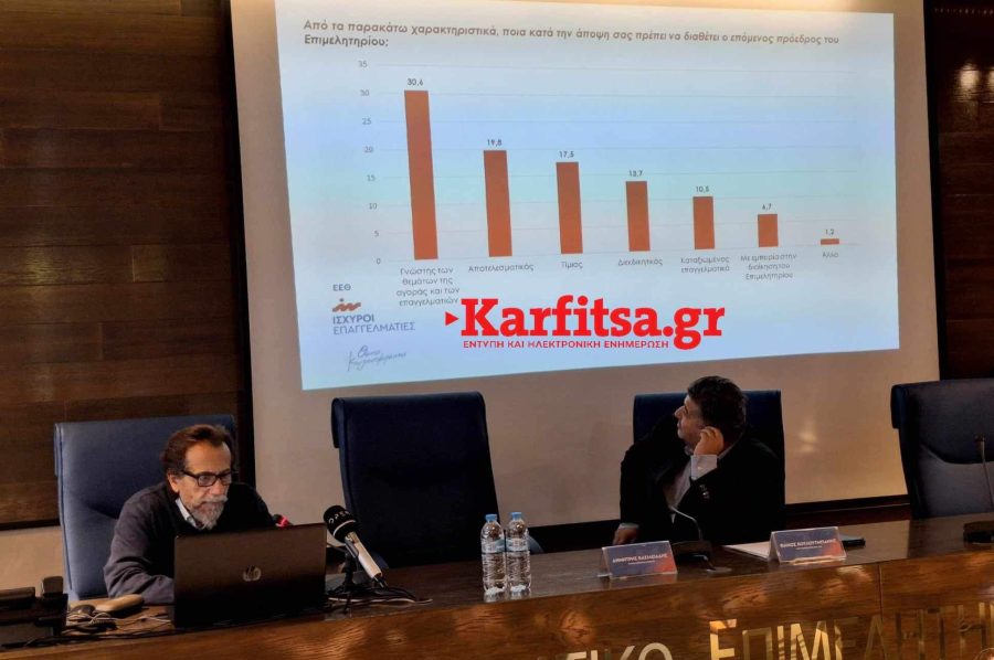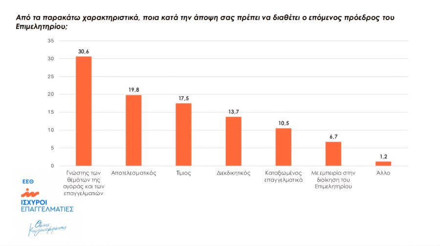 Ενώ ο δημοσκόπος, Κώστας Βασιλειάδης δήλωσε από την πλευρά του: «Διενεργήσαμε μια έρευνα προεκλογικά για να ιεραρχήσουμε τα προβλήματα των επιχειρηματιών. Η συμμετοχή και το ενδιαφέρον ήταν μεγάλο. Οι επιχειρηματίες ζητούν λύσεις και είναι πολύ λογικό να τις ψάχνουν σε θεσμούς όπως είναι τα Επιμελητήρια. Τα βασικά προβλήματα που αναδείχθηκαν είναι η ακρίβεια και το κόστος της ενέργειας. Είναι στοιχεία που τα βρίσκουμε και σε καταναλωτικές έρευνες. Η ακρίβεια δεν είναι μόνο καταναλωτικό πρόβλημα, είναι και επιχειρηματικό. Όπως επίσης και το κόστος ενέργειας γιατί αυξάνει το κόστος παραγωγής και των υπηρεσιών. Κάνει τα προϊόντα και τις επιχειρήσεις τους μη ανταγωνιστικές και πιο δύσκολες να φτάσουν στον καταναλωτή. Τα μέλη ζητούν πρόσβαση σε χρηματοδότηση. Αυτό είναι ένα πάγιο αίτημα της αγοράς γιατί έχει δυσκολέψει η πρόσβαση στον δανεισμό από τις τράπεζες. Ένα επίσης σημαντικό εύρημα αφορά στα χαρακτηριστικά που θέλουν τα μέλη να έχει ο αυριανός πρόεδρός τους. Θέλουν να είναι άνθρωπος και γνώστης της αγοράς. Δηλαδή ένας από αυτούς. Δεν παίζει τόσο μεγάλη σημασία αν έχει ασκήσει ήδη διοικητικά καθήκοντα σε οποιοδήποτε φορέα. Θέλουν να καταλαβαίνει τα προβλήματά τους ώστε οι λύσεις που προτείνει να είναι συμβατές με τα θέλω των επιχειρηματιών».