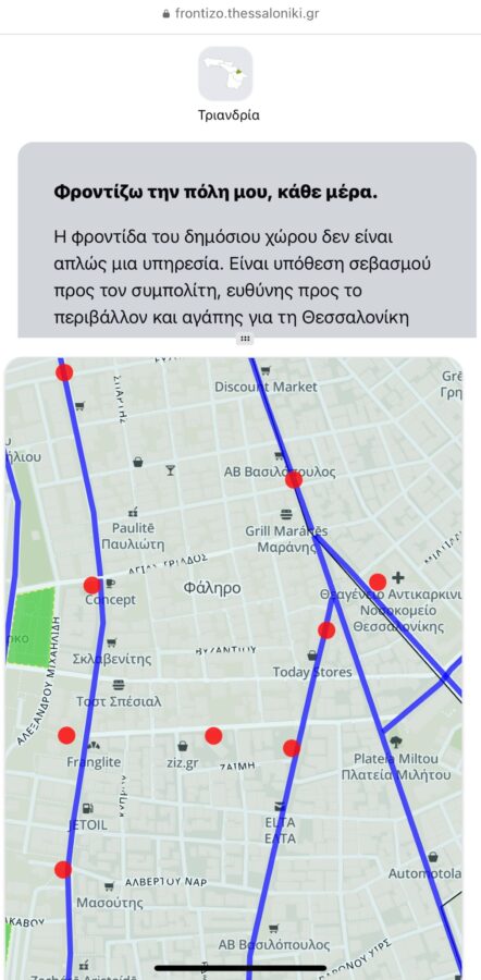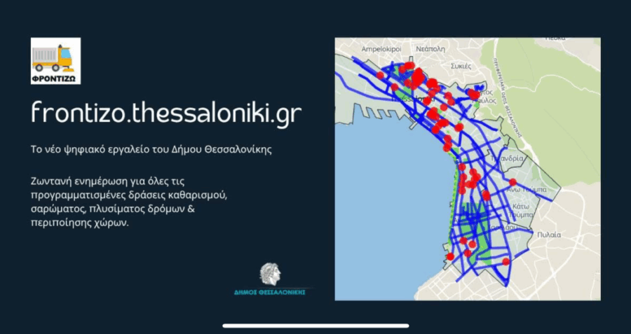 Απαντήσεις σε όλα τα παραπάνω αλλά και αρκετά ακόμη ζητήματα που αφορούν τις δράσεις καθαρισμού, σαρώματος, πλυσίματος δρόμων, περιποίησης πρασίνου, απομάκρυνσης ογκωδών θα δίνει η καινοτόμα εφαρμογή που φέρει τον τίτλο «Φροντίζω για την Πόλη μου» (frontizo.thessaloniki.gr).
