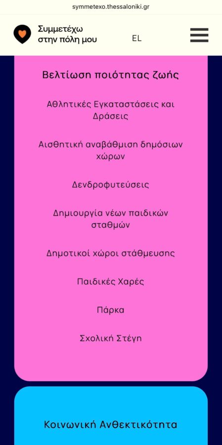 Παράλληλα, βρίσκεται ήδη σε λειτουργία μια δεύτερη εφαρμογή με τον τίτλο «Συμμετέχω στην Πόλη μου» (symmetexo.thessaloniki.gr). Μέσω αυτής, οι πολίτες μπορούν να βλέπουν τις παρεμβάσεις, τα μικρά και μεγάλα έργα, που γίνονται μέσω χορηγιών ή προγραμμάτων εταιρικής κοινωνικής ευθύνης.