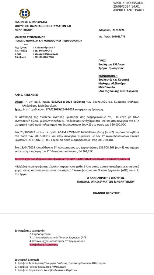Μάλιστα, εξ ‘αυτού εκτέθηκε και ο αναπληρωτής υπουργός Αθλητισμού κ. Γιάννης Βρούτσης ο οποίος υποχρεώθηκε να απαντήσει σε επερώτηση της βουλευτού ΣΥΡΙΖΑ Χαλκιδικής Κυριακής Μάλαμα καταθέτοντας έγγραφα στα οποία μεταξύ άλλων υπάρχει και η βεβαίωση περαίωσης (!) ενός έργου που δεν έγινε!