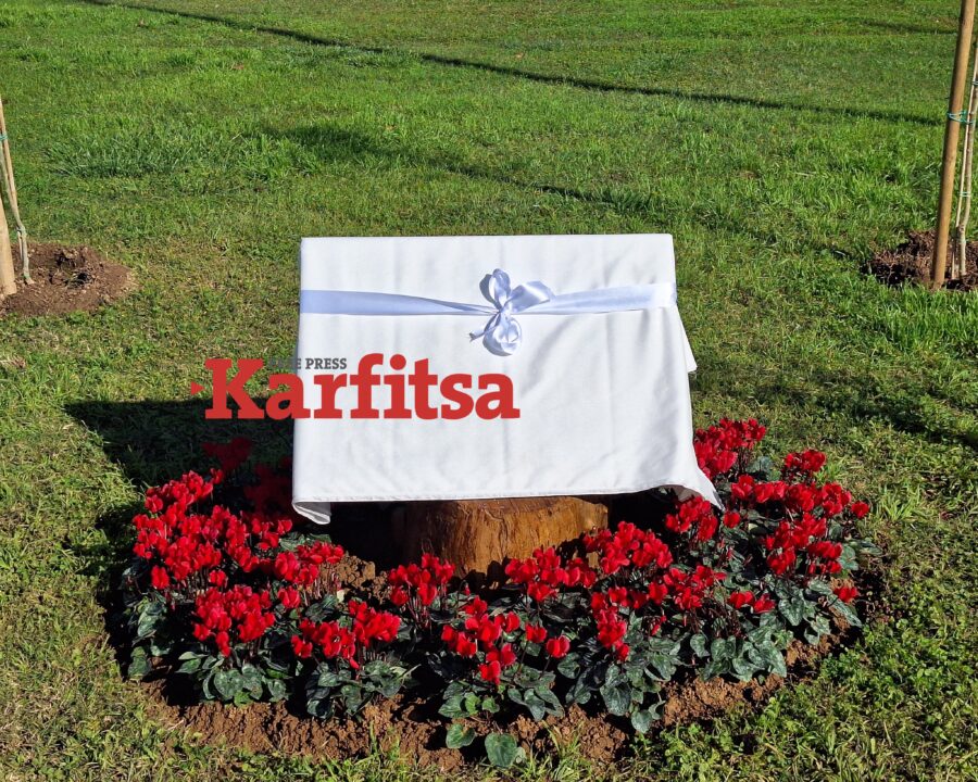 Η μαρμάρινη πλάκα τοποθετήθηκε ανάμεσα στα αγάλματα του Μεγάλου Αλεξάνδρου και του Κωνσταντίνου Καραμανλή.