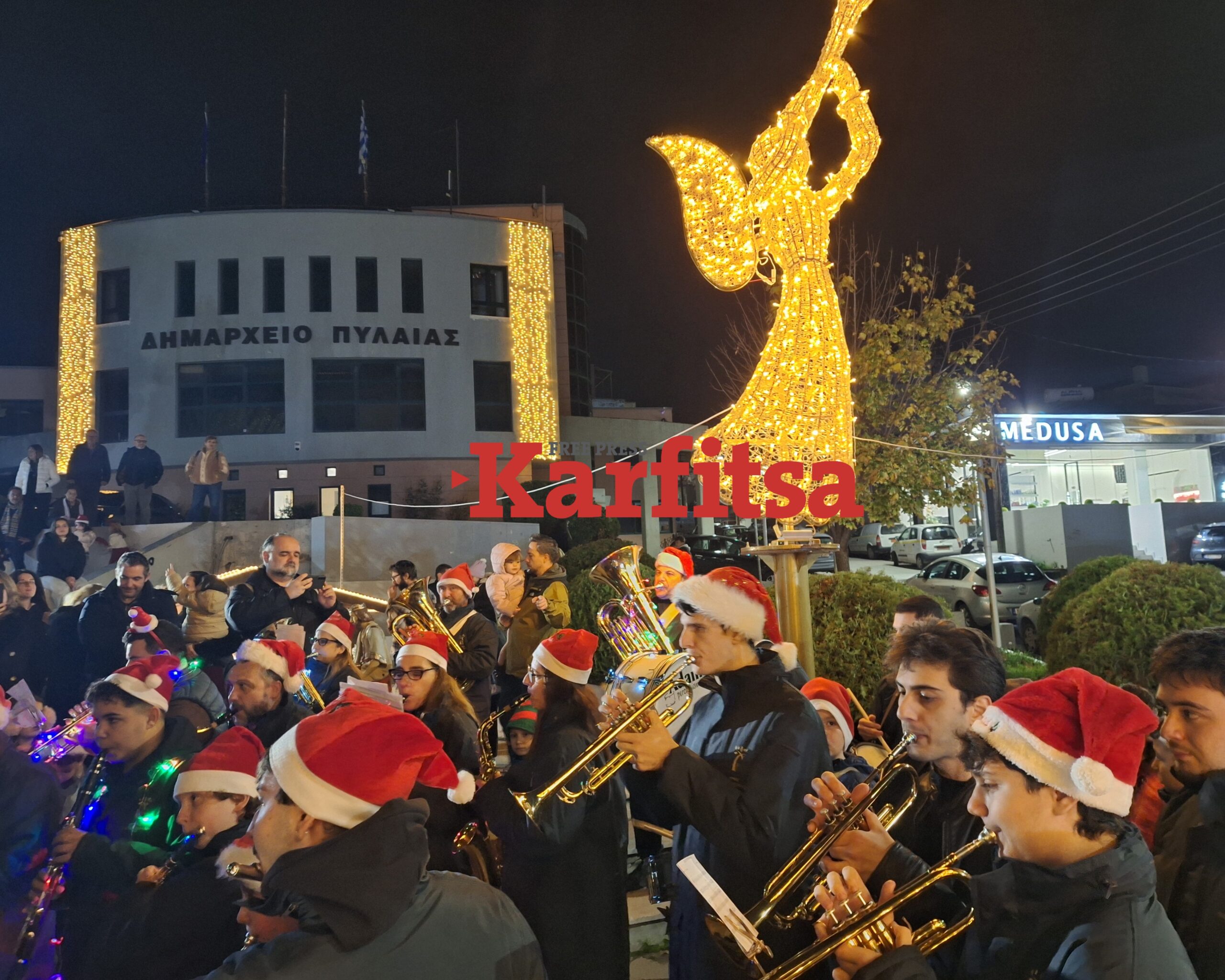 Με λαμπρότητα και πλήθος δημοτών σε γιορτινή διάθεση φωταγωγήθηκε το χριστουγεννιάτικο έλατο έξω από το πρώην δημαρχείο Πυλαίας, στην ανατολική Θεσσαλονίκη, στο πλαίσιο των εορταστικών εκδηλώσεων του δήμου Πυλαίας – Χορτιάτη, το βράδυ της Κυριακής 07/12.