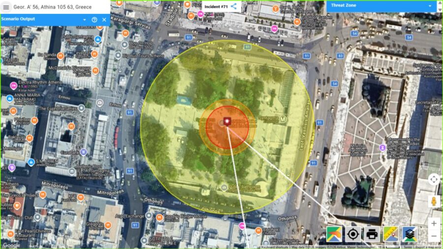Με βάση τα δύο στιγμιότυπα (μοντέλο TNT Blast – 50 kg TNT στο κέντρο της Πλατεία Συντάγματος), η εκτίμηση υπερπίεσης κατανέμεται σε τρεις κύριες ζώνες: