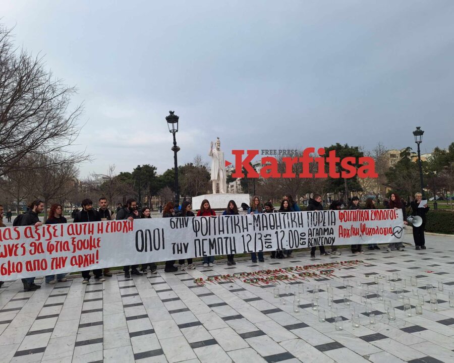 Ειδικότερα, οι φοιτητές άναψαν το απόγευμα της Τετάρτης 57 κεριά και άφησαν 57 λουλούδια στο άγαλμα Βενιζέλου για τους νεκρούς των Τεμπών, ενώ σήκωσαν γιγαντοπανό που έγραφε «Δε μας αξίζει αυτή η εποχή, με αγώνες θα φτιάξουμε τον κόσμο από την αρχή».