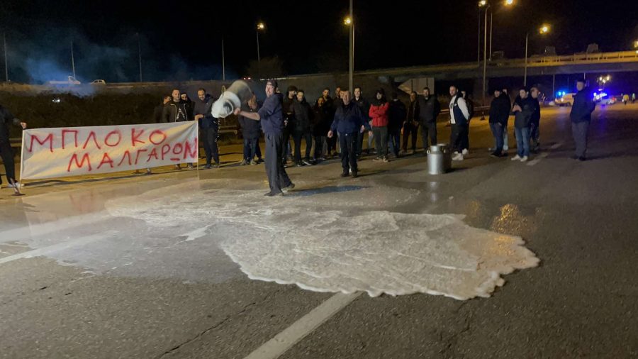 Οι αγρότες κατέβηκαν πεζοί στην εθνική και έριξαν γάλα στο δρόμο.