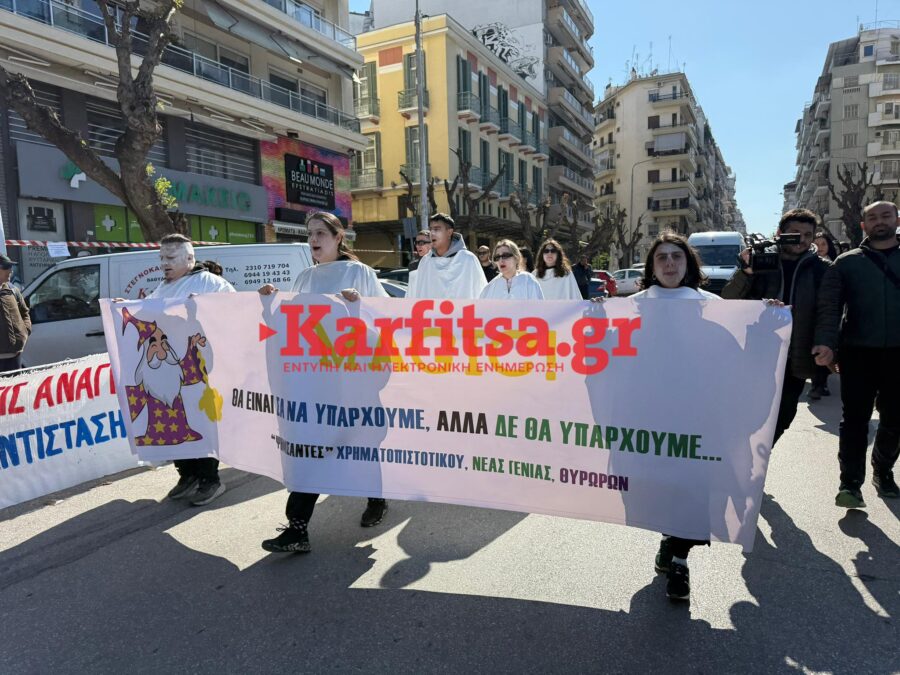 Έξω από το ΕΚΘ έφτασε μια ομάδα ατόμων όπου με βαμμένα τα πρόσωπα τους λευκά και φορώντας λευκά σεντόνια εμφανίστηκαν σαν φαντάσματα των εργατικών σωματείων.