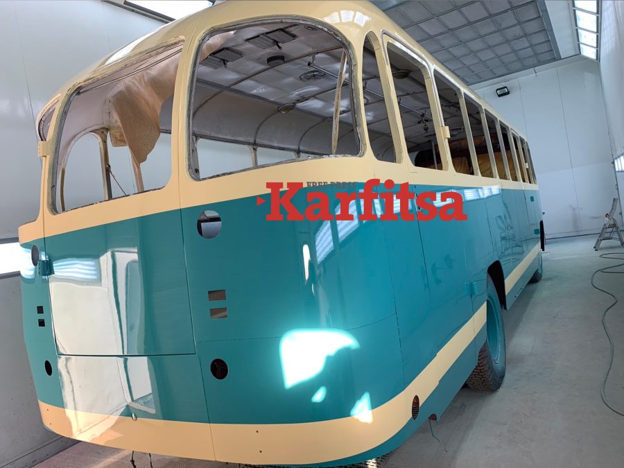 Όπως θα δείτε στις φωτογραφίες της Karfitsa, η εγκατάλειψη και η απαξίωση ήταν παραπάνω από εμφανή στο λεωφορείο, το οποίο ήταν παρατημένο για περισσότερες από δύο δεκαετίες. Στο πλαίσιο της αναπαλαίωσής του, δόθηκε έμφαση στη λεπτομέρεια, ώστε να είναι πιστό στα πρότυπα της δεκαετίας του 1960. Πρόκειται για ένα από τα πιο αντιπροσωπευτικά λεωφορεία εκείνης της δεκαετίας, κατά την οποία οι υπεραστικές συγκοινωνίες πέρασαν μια εποχή άνθησης. Υπηρέτησε για περίπου τέσσερις δεκαετίες τις συγκοινωνιακές ανάγκες της Ημαθίας.