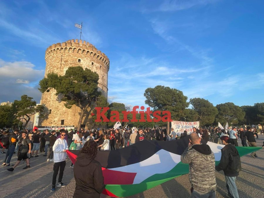 Αυτή την ώρα, οι φοιτητές έχουν συγκεντρωθεί μπροστά στο Λευκό Πύργο κρατώντας σημαίες της Παλαιστινης και πλακάτ, ενώ μπροστά στο μνημείο έχει υψωθεί μια μεγάλη σημαία της Παλαιστινης, στην οποία αναγράφεται «Η ιστορία έχει μία σωστή πλευρά. Με την Παλαιστίνη ως τη Λευτεριά».
