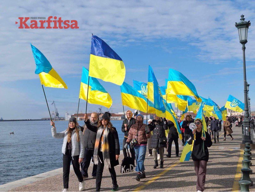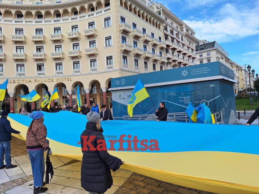 Με ουκρανικές σημαίες στα χέρια και ζητώντας να σταματήσει ο πόλεμος και να σταθεί η δύση στο πλευρό τους, οι Ουκρανοί συγκεντρώθηκαν το πρωί της Κυριακής στην πλατεία Αριστοτέλους, φωνάζοντας μηνύματα για τη χώρα τους, δύο χρόνια σχεδόν μετά από τη ρωσική εισβολή.