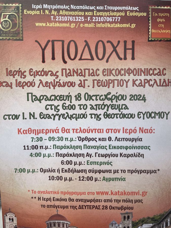 Πλήθος κόσμου βρίσκεται στον Ι.Ν Ευαγγελισμού της Θεοτόκου στον Εύοσμο, για να χαιρετίσει και να πάρει την ευλογία από την ιερή εικόνα της Παναγίας Εικοσιφοίνισσας και τα λείψανα του Αγίου Γεωργίου του Καρσλίδη.