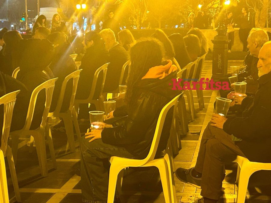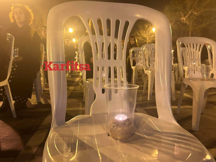 Συγκεκριμένα, στο Άγαλμα Βενιζέλου, στο κέντρο της πόλης, άνθρωποι κάθισαν σε 57 καρέκλες που δεν έπρεπε να αδειάσουν για όσες ώρες θα διαρκούσε το δρομολόγιο του μοιραίου τρένου που ξεκίνησε στις 19:22 και συγκρούστηκε με την εμπορική αμαξοστοιχία στις 23:22.