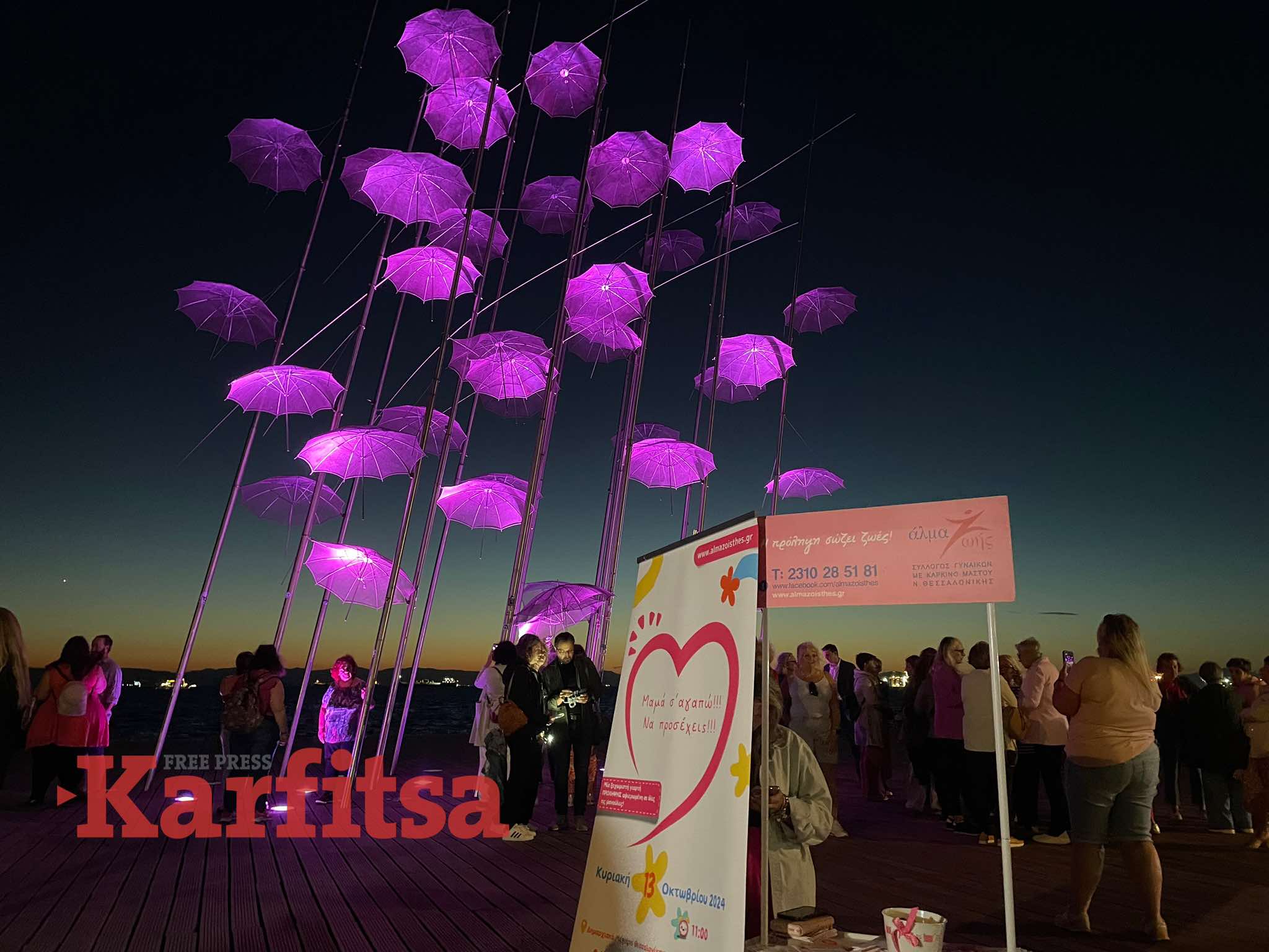 Εμείς το Άλμα Ζωής, μαζί με τον Δήμο Θεσσαλονίκης και το Ίδρυμα Γεωργίου Ζογγολόπουλου είμαστε εδώ για να στείλουμε το μήνυμα γιατί μόνο μαζί μπορούμε να νικήσουμε τον καρκίνο του μαστού. Δυστυχώς αυξάνονται πάρα πολύ τα ποσοστά στις γυναίκες. Από μια στις εννέα που ήταν, τώρα μία στις οκτώ γυναίκες νοσούν από καρκίνο του μαστού κι αυτό τείνει να φτάσει στο μια στις επτά ενώ ένας στους εκατό άνδρες νοσούν από καρκίνο του στήθους για αυτό αν νιώσουν κάτι, αν πιάσουν κάτι πρέπει να πάνε αμέσως στον γιατρό», δηλώνει στην Karfitsa η κυρία Κυριακούλα Δερεκενάρη, πρόεδρος Άλμα Ζωής, Σύλλογος Γυναικών Με Καρκίνο του Μαστού νομού Θεσσαλονίκης.