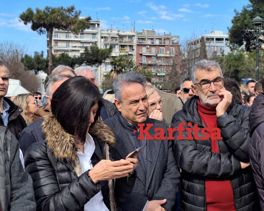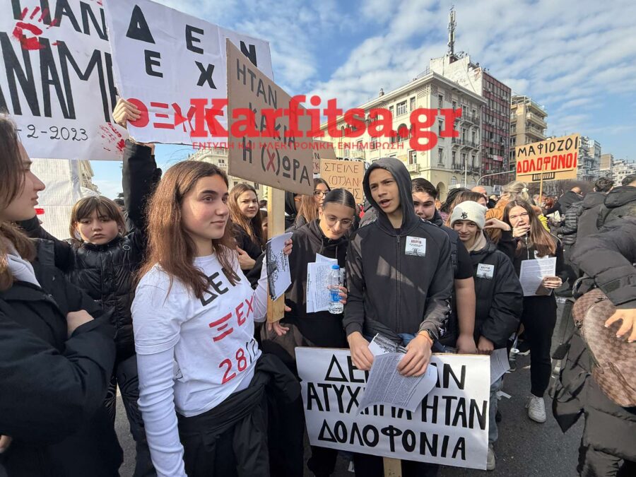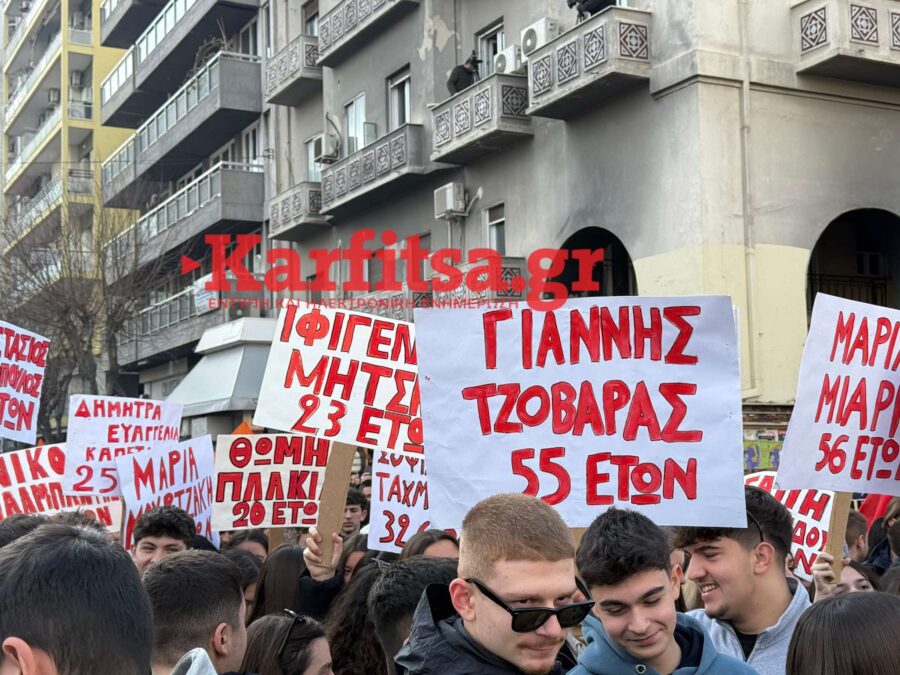 Μαθητές από το Πειραματικό Γυμνάσιο και Λύκειο άφησαν το σχολείο τους και κατέβηκαν στη συγκέντρωση κρατώντας πλακάτ με τα όνομα των 57 θυμάτων της τραγωδίας.