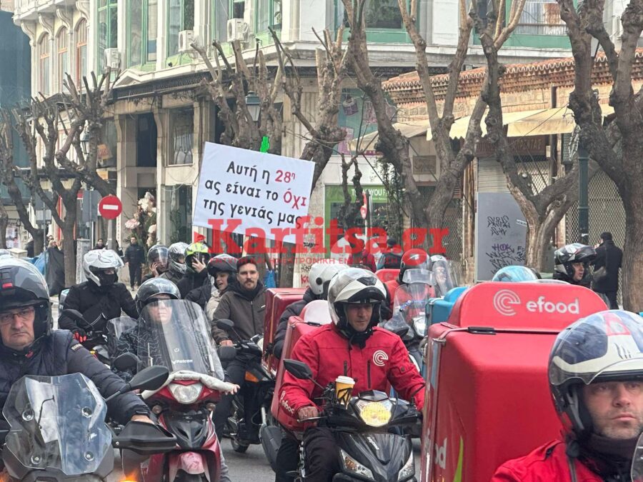 Με τα δίκυκλα τους κατευθύνονται στο σημείο συνάντησης που θα ξεκινήσει η μεγάλη πορεία για τα Τέμπη και οι διανομείς