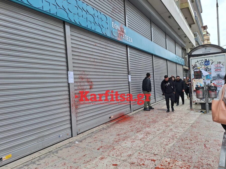 15:45 Άγνωστοι πέταξαν μπογιές στην Εθνική Τράπεζα στην οδό Εγνατία