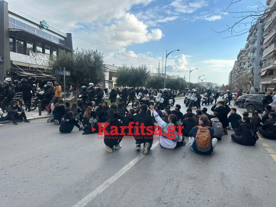 16:10 Διαδηλωτές πραγματοποιούν καθιστική διαμαρτυρία στην οδό Αγγελάκη