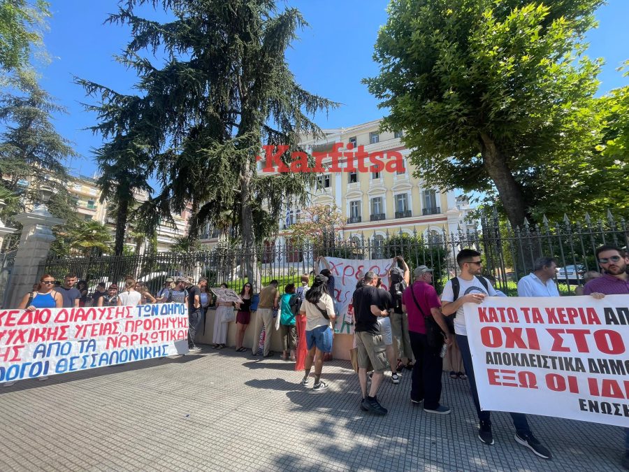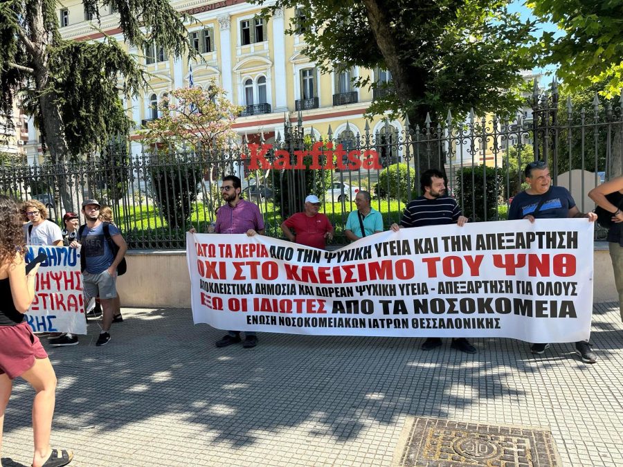 Συγκεκριμένα, λίγο μετά τις 11:00 η Ένωση Νοσοκομειακών Ιατρών Θεσσαλονίκης (ΕΝΙΘ), αλλά και τα σωματεία εργαζομένων στο ΚΕΘΕΑ και στο Ψυχιατρικό Νοσοκομείο Θεσσαλονίκης συγκεντρώθηκαν έξω απο το ΥΜΑΘ προκειμένου να διαμαρτυρηθούν για το υπό διαβούλευση νομοσχέδιο για τη ψυχική μεταρρύθμιση.