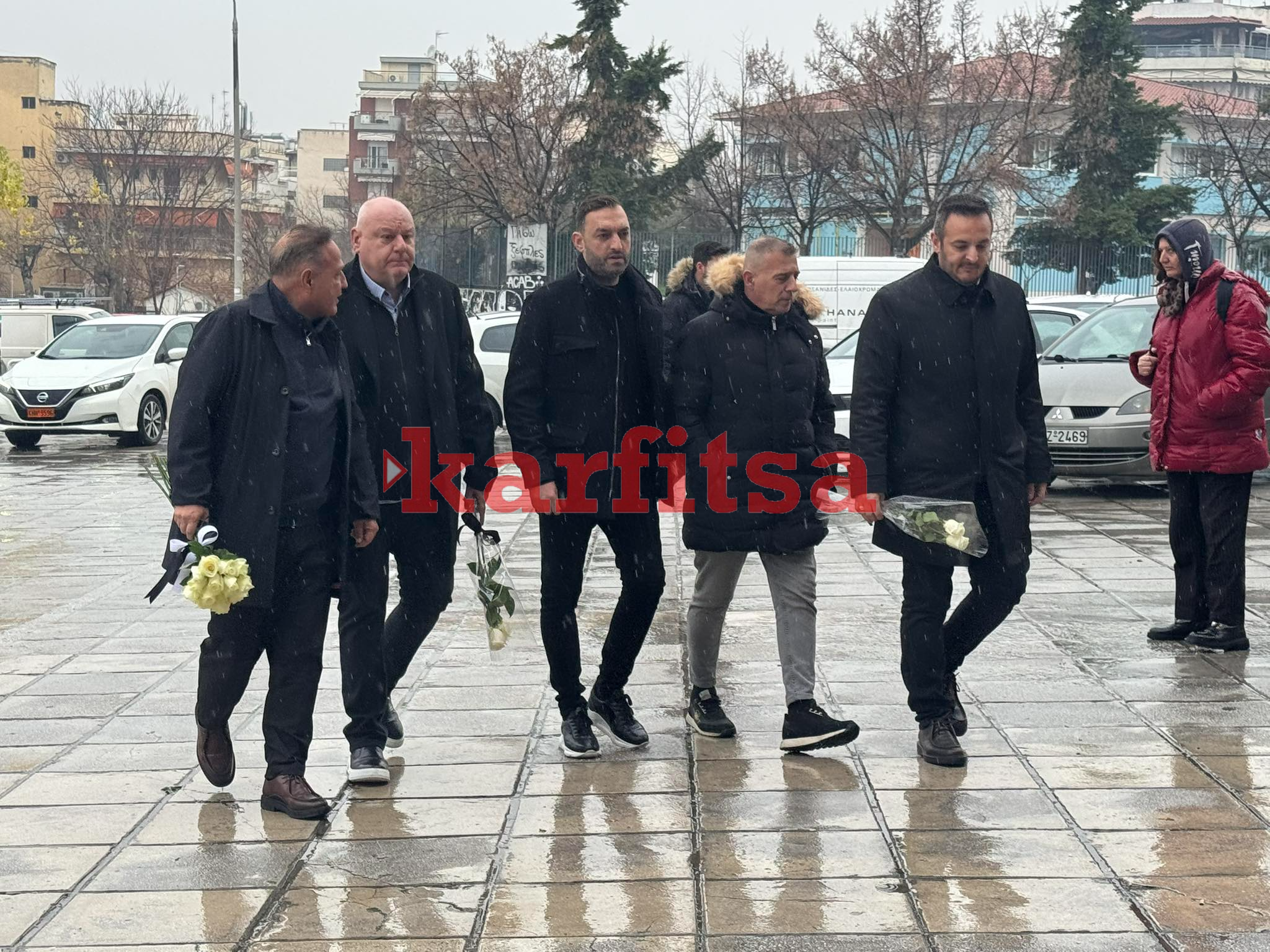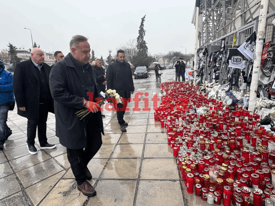 Ο κ. Αγγελούδης, συνοδευόμενος από τον αντιδήμαρχο Ψηφιακής Πολιτικής, Διοικητικής Αναδιάρθρωσης και Εξυπηρέτησης του Πολίτη και πρόεδρο της επιτροπής για τα 100 χρόνια του ΠΑΟΚ, Κώστα Βασιλόπουλο, τον αντιδήμαρχο Μέριμνας για την Τρίτη Ηλικία, Κοινοτήτων και Δημοτικών Αποκέντρωσης, Παντελή Καζαντζίδη, τον δημοτικό σύμβουλο και πρώην άσο του Δικεφάλου, Γιώργο Τουρσουνίδη, τον δημοτικό σύμβουλο και πρώην ποδοσφαιριστή του Άρη, Σάκη Πρίττα και τον πρώην μπασκετμπολίστα που τίμησε τα ασπρόμαυρα χρώματα και μέλος της δημοτικής του παράταξης, Γιάννη Γιαννούλη, άφησε τα λουλούδια σε ένδειξη πένθους και σεβασμού προς τους επτά νεκρούς και τους τρεις τραυματίες.