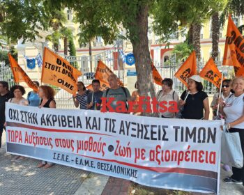 «Όχι στην ακρίβεια και στις αυξήσεις τιμών, τώρα αυξήσεις στους μισθούς για ζωή με αξιοπρέπεια». Με αυτό το σύνθημα εκπαιδευτικοί της Θεσσαλονίκης πραγματοποίησαν συγκέντρωση διαμαρτυρίας έξω από ΥΜΑΘ με πανό και συνθήματα.