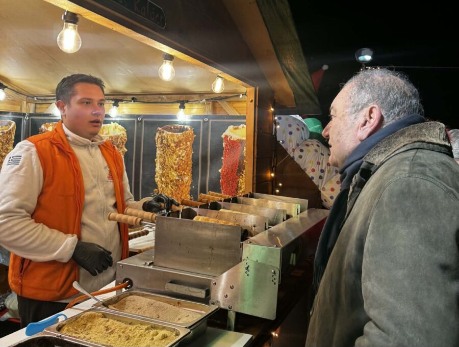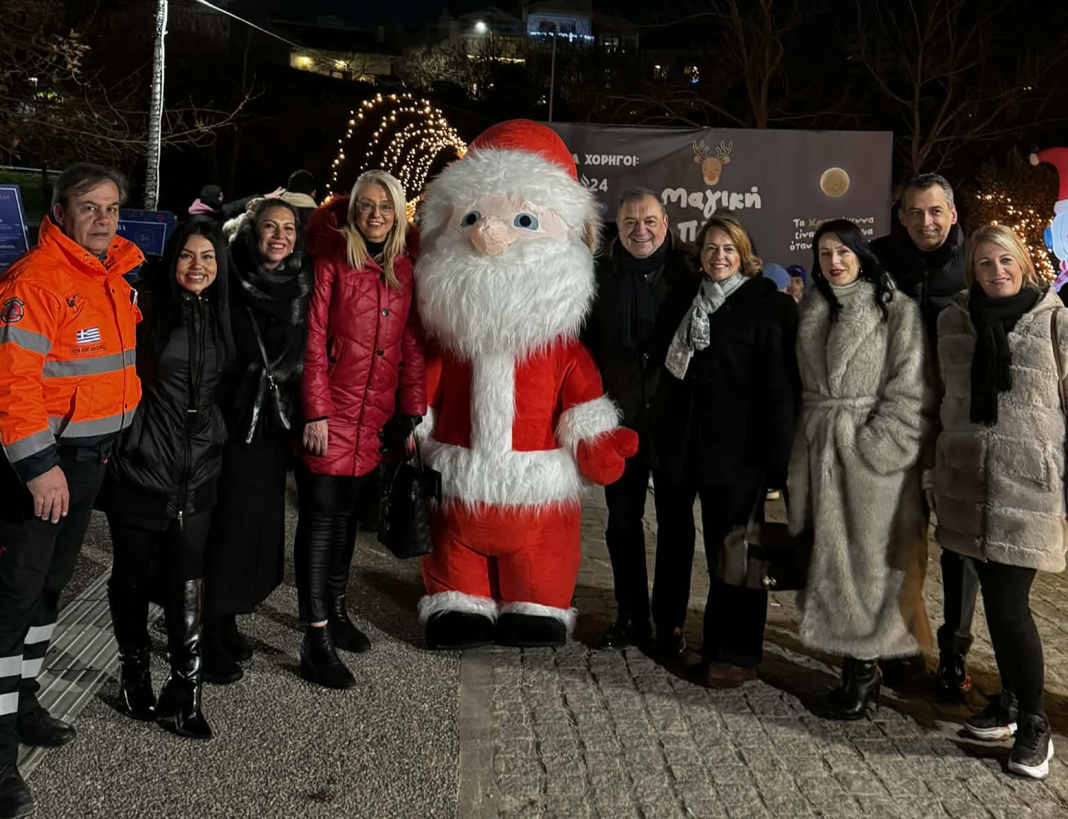 Ο κ. Καϊτεζίδης δοκίμασε προϊόντα της χριστουγεννιάτικης αγοράς και φωτογραφήθηκε με τη μασκότ της Μαγικής Πόλης, αλλά και με τον Άγιο Βασίλη.